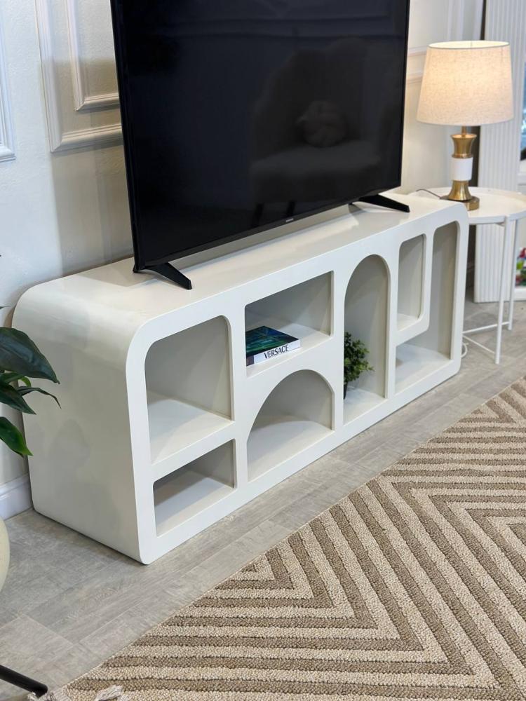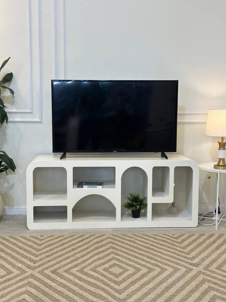 طاولة بلازما أنيقة بلون أبيض ناعم، مصنوعة من خشب عالي الجودة لضمان المتانة والاستدامة. تصميمها العصري يضفي لمسة راقية على ديكور غرفة المعيشة أو المجلس، مع سطح واسع لعرض الأجهزة الإلكترونية والديكورات المفضلة لديك. ارتفاعها المثالي يوفر راحة في الاستخدام وسهولة في الوصول إلى المحتويات المعروضة.