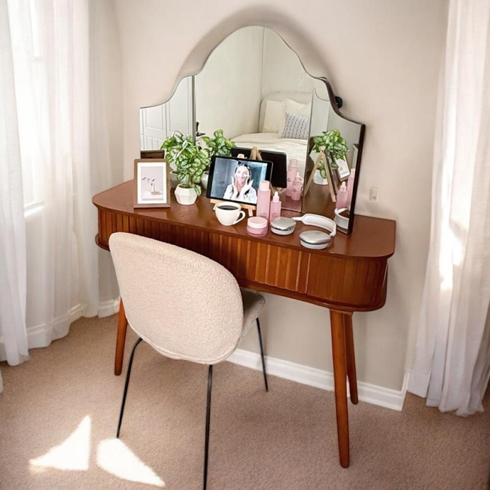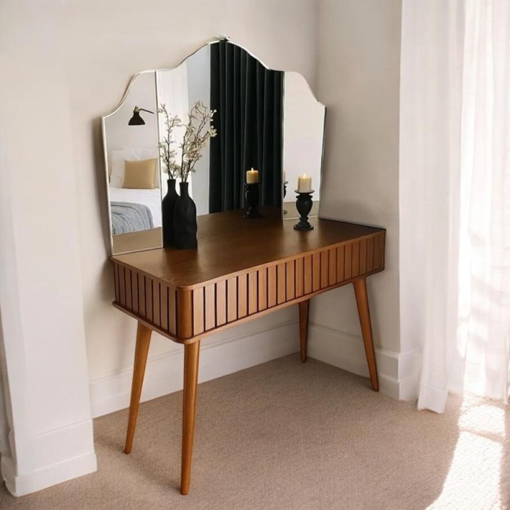 أضف لمسة من الفخامة والدفء إلى غرفة نومك مع هذه التسريحة الخشبية المصممة بأسلوب عصري مستوحى من الطراز الكلاسيكي. تأتي بتفاصيل دقيقة مثل الأخاديد الرأسية على الأدراج والأرجل الرفيعة المائلة، مما يمنحها طابعًا مميزًا يليق بأرقى المساحات.